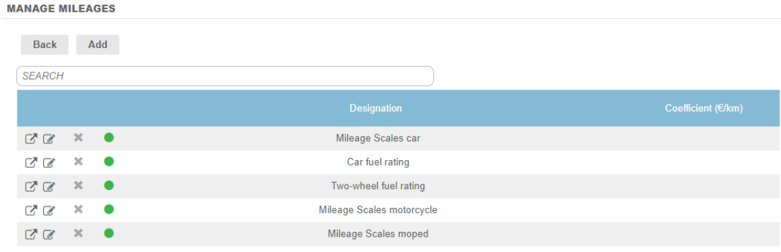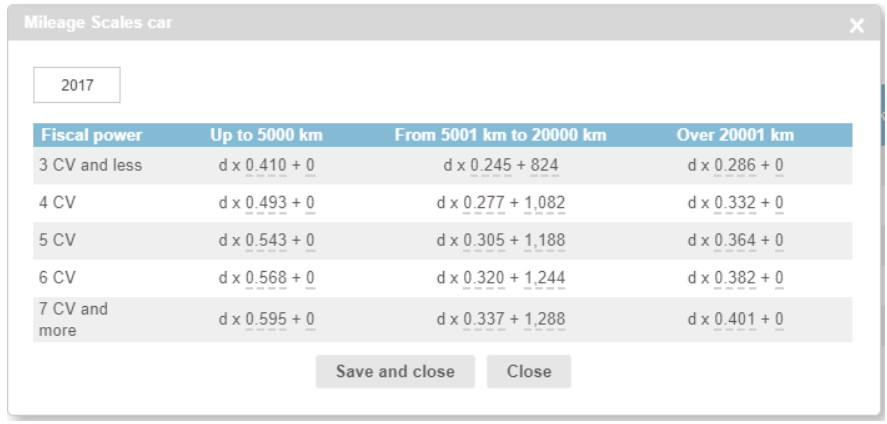 Once the “Activate Vehicle Management” setting is activated, the official mileage scales published by the tax department are available. As this is official scales, no changes can be made.