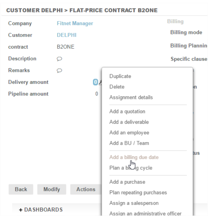 In "Invoicing schedule = Contract and Deposit" Fitnet automatically generates proposed invoices according to the parameters entered on the contract: