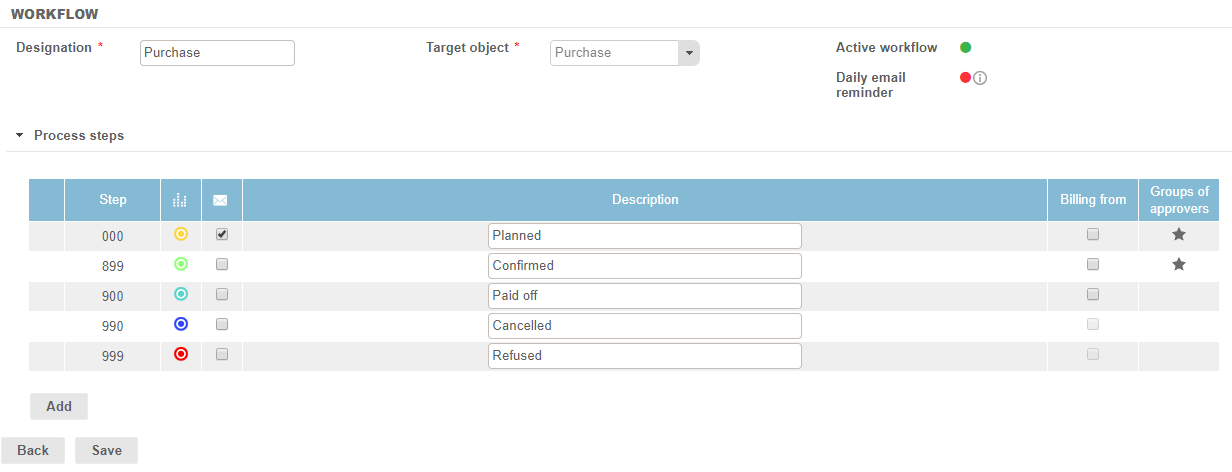 The "Billing from" column allows you to decide at which step the billable purchases must be invoiced (i.e., must generate an invoice proposal).