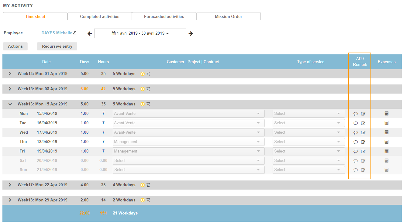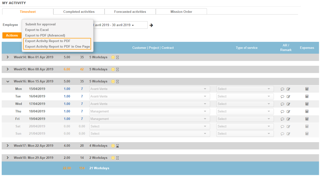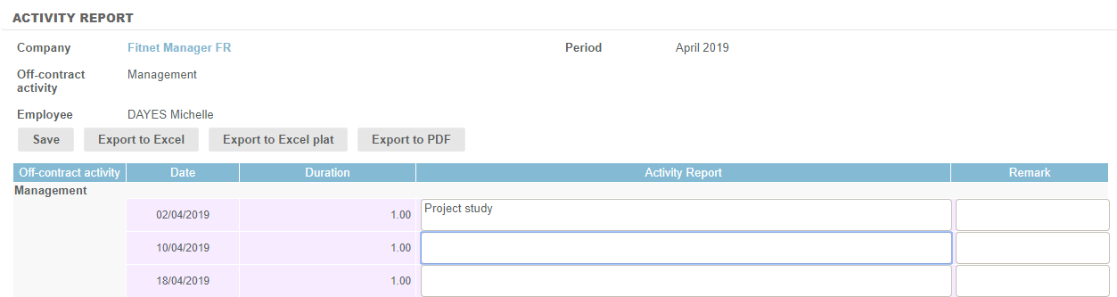 An Activity Report feature is available on each line entered in the timesheet. It allows to report in detail the activity performed on each reported time.
