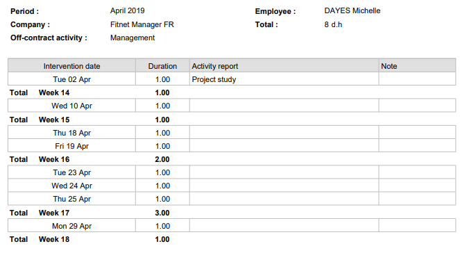 The Activity Report is available when invoicing contracts. It can be directly and easily attached to the invoice to provide the customer with details of the activity performed.