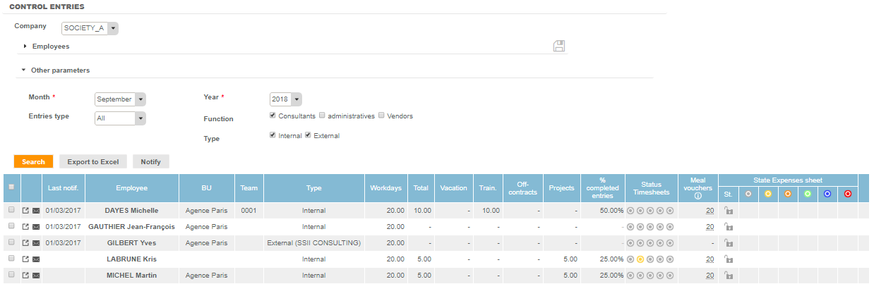 The "Control Entries" reporting allow you to view workflows status for particular items and for all employees: timesheets, expenses, meal vouchers. The icon color quickly shows you the status for a particular item.