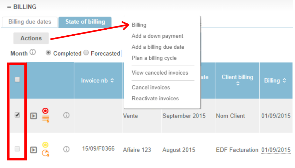 - Select the invoice proposals you want to invoice from the billing section > Actions > Billing