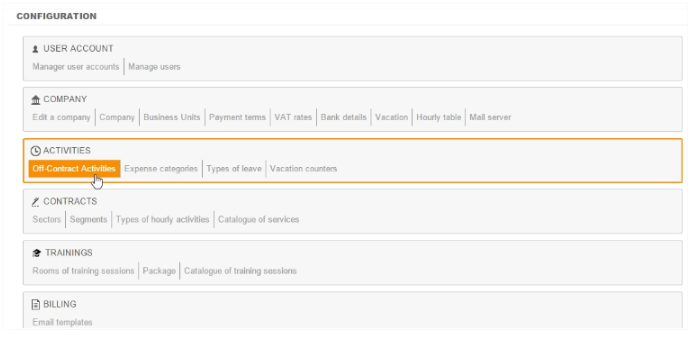 Go to : Configuration > Activities section > Off-Contract Activities