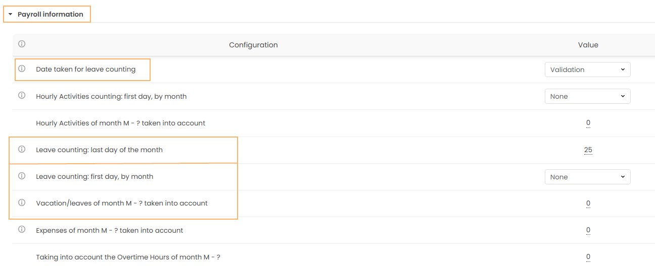 Please note that this value is taken into account only if the parameter "Payroll Information Report of month M : Vacation/leaves of month M - ? taken into account" is of 0 (default value).