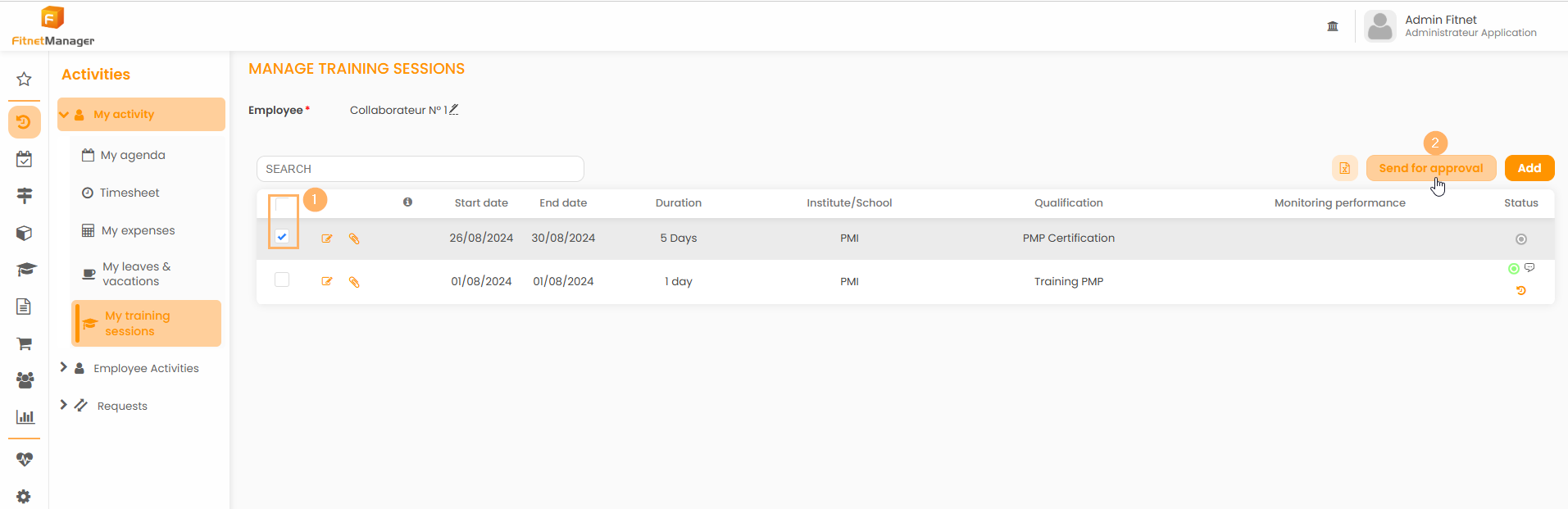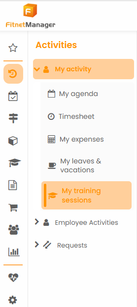 To submit your request for training, you have to go to the Activities module > Training sessions.