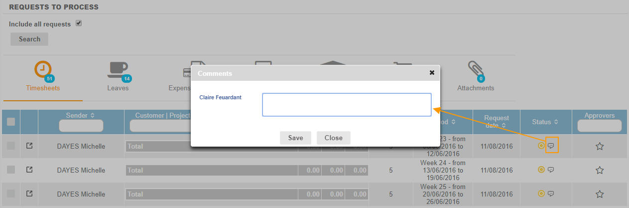 The discussion thread allows the requester and the approver to exchange comments without multiplying emails. The approver can, for example, enter a comment to ask the requester to edit his timesheet entries before returning the request. The requester will thus understand why his timesheet has not been validated.