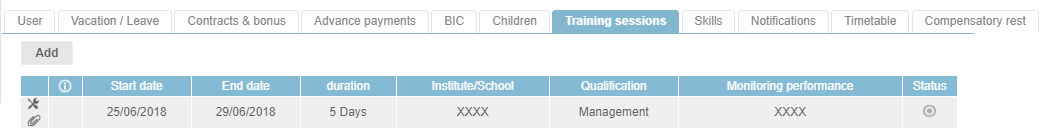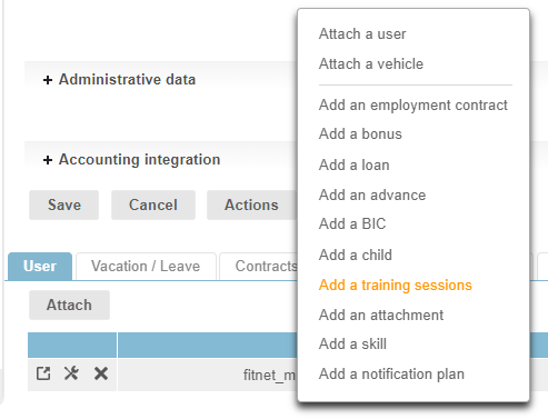 The “Actions” button in the HR folder allows you to add training sessions to an employee.