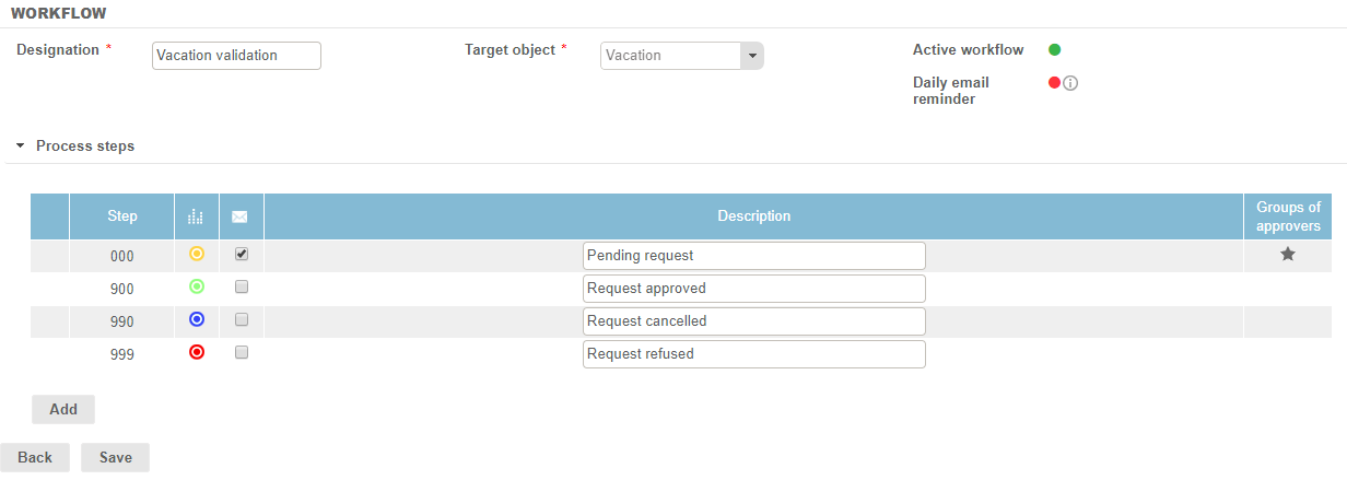 - 3 "validation" steps: 3 options are available for the approver to process the requests.