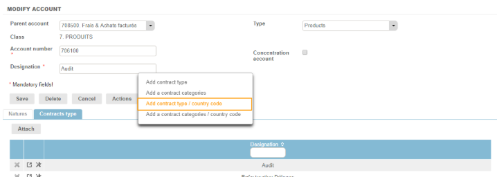In this example, a sale for an Accounting contract for a French customer will be broken down into the 706100 product account. However, for the same contract, if it is an Italian customer, the product account is not configured.
