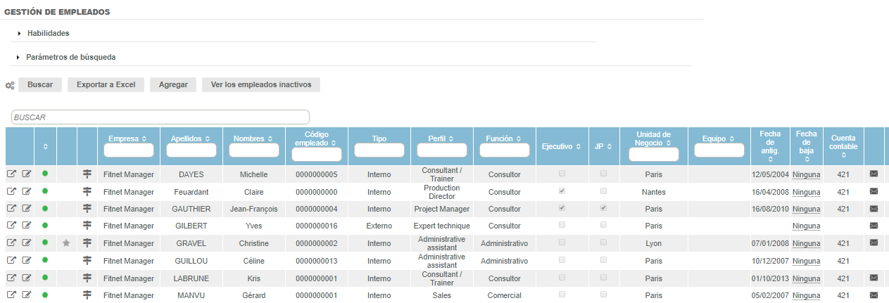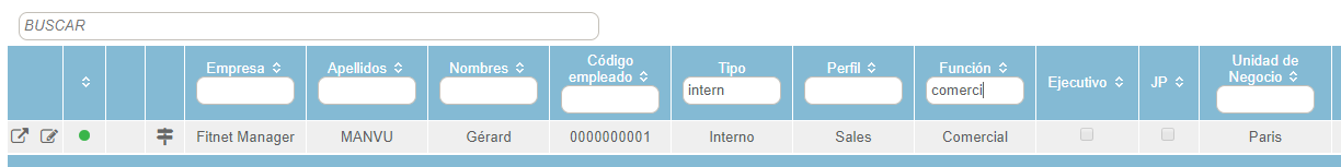 La tabla permite encontrar un empleado directamente desde los campos característicos del empleado. Esta tabla es modificable, como la mayoría de las tablas de Fitnet Manager: puede seleccionar las columnas con el botón