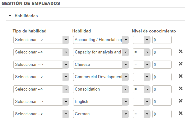Si el parámetro "Visualizar automáticamente las habilidades en el filtro" está activo, podemos filtrar a los empleados directamente por habilidades: