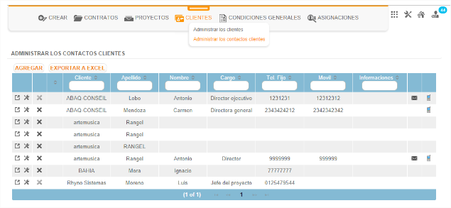 El menú Cliente > “Gestiona los contactos clientes” permite acceder a la lista de contactos clientes de la empresa con el conjunto de informaciones principales. La lista de contactos se presenta en forma de tabla que puede ser exportada en formato xls.
