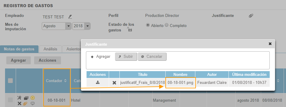 El contador permite, por tanto, identificar y enlazar las notas de gastos y los justificantes. El número se genera automáticamente y no se puede cambiar, no puede haber duplicados.