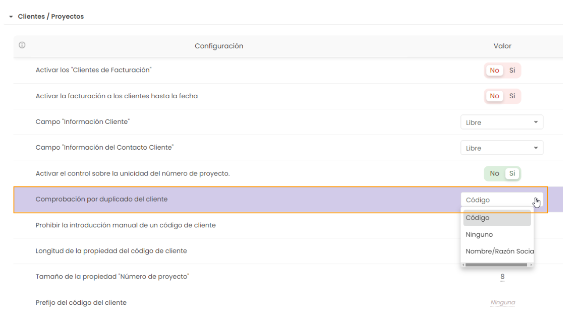 El control de duplicados es un parámetro activable/desactivable desde la configuración de la aplicación: Parámetros > Pestaña 'Contratos' > Sección 'Clientes / Proyectos'