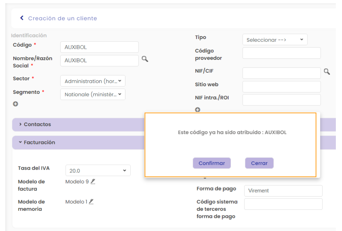 - Si el parámetro "Generación automática del Código del Cliente" está desactivado, entonces, en caso de duplicado, aparecerá un mensaje de advertencia, pero aún será posible crear un prospecto/cliente con el mismo código que otro prospecto/cliente que ya existe