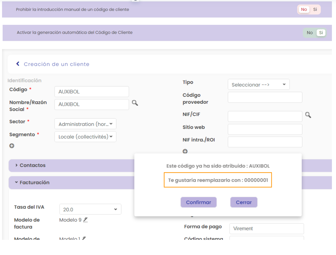 Consulta este artículo para más detalles sobre la incrementación automática del código de cliente.