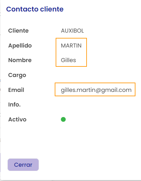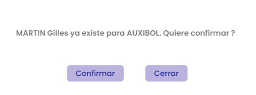 Aquí, se intenta crear un contacto con un nombre / apellido* que existe en la base de datos de contactos cliente para la empresa AUXIBOL y sin proporcionar una dirección de correo electrónico: