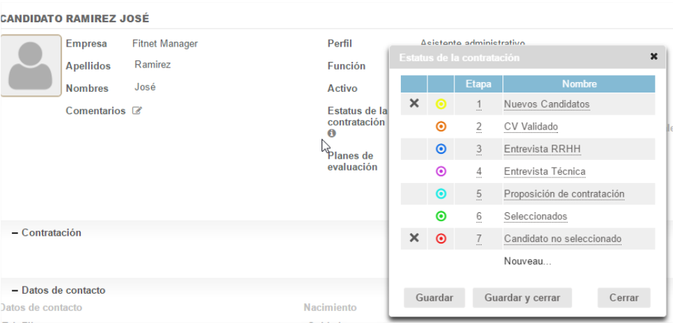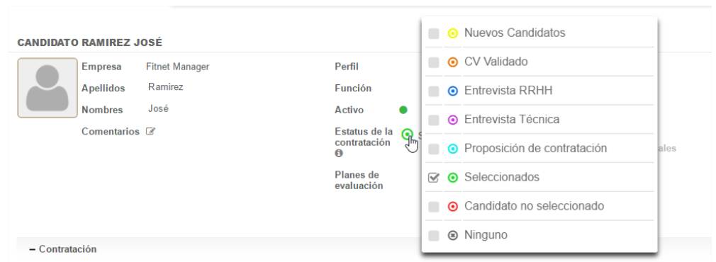 Para cambiar el estatus de un candidato, presionar el icono de color al lado del campo "Estatus de la contratación" y seleccionar el estatus deseado.
