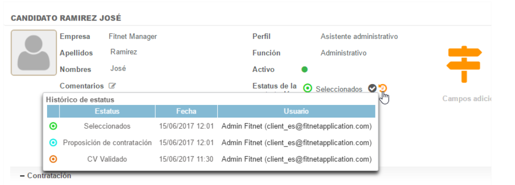 Al pasar el cursor sobre icono situado a la derecha , se muestra el historial de los estatus de contratación con el estatus, la fecha y el usuario que ha realizado la actualización.