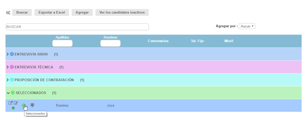 La lista de los candidatos está organizada por estatus de contratación. Es posible modificar el estatus directamente en la tabla presionando el icono con el color del "estatus".