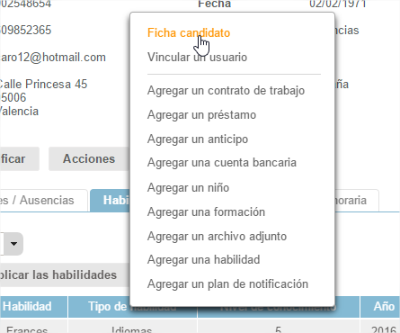 Las habilidades del candidato también se mantienen en la ficha del empleado.
