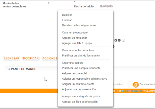 El botón acciones reagrupa el conjunto de funciones disponibles en un contrato.