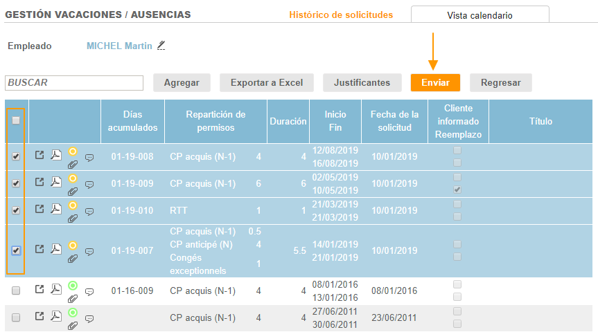1/ Marque la casilla de la solicitud o las solicitudes correspondientes y haga clic en el botón "Enviar"