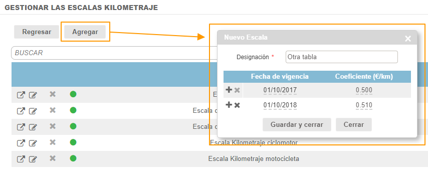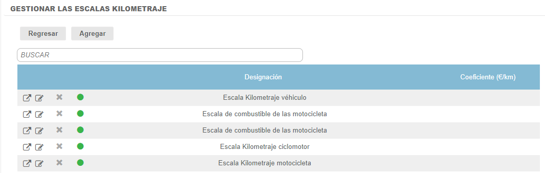 Al activar la opción “Activar la gestión de vehículos”, el Barómetro de kilometraje oficial publicado por la agencia tributaria está disponible. Al tratarse de un baremo oficial, no puede modificarse.