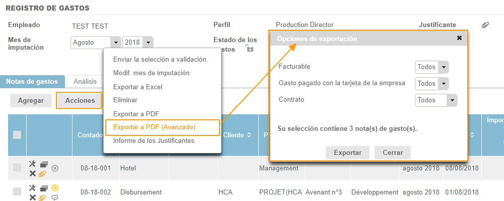 La exportación avanzada a PDF permite elegir si se exportan o no los gastos facturables y si han sido pagados o no por la empresa mediante las notas de gastos seleccionadas.