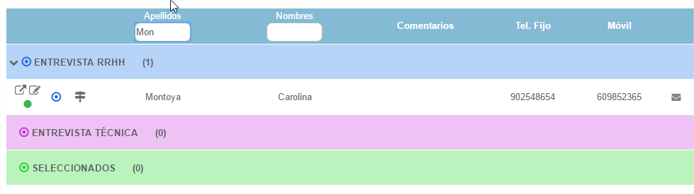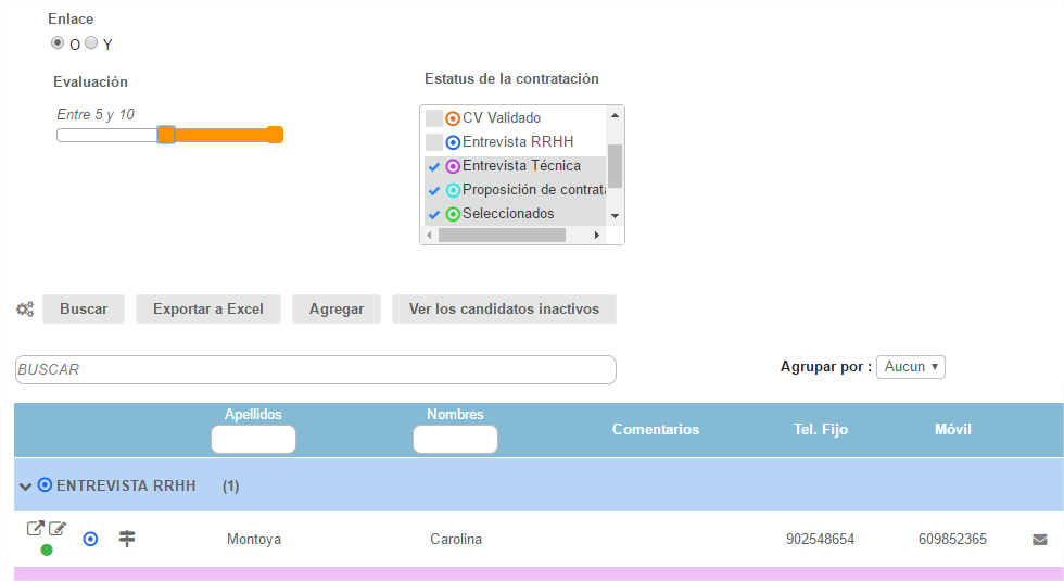 Estos filtros permiten por ejemplo, buscar candidatos con una evaluación superior a 5 y en el estatus de contratación final. Después de establecer los criterios, debemos presionar el botón "Buscar" y la lista de candidatos que cumplen con estos criterios serán listados: