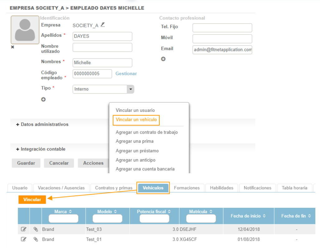Se puede asociar un vehículo directamente desde la ficha de Empleado: