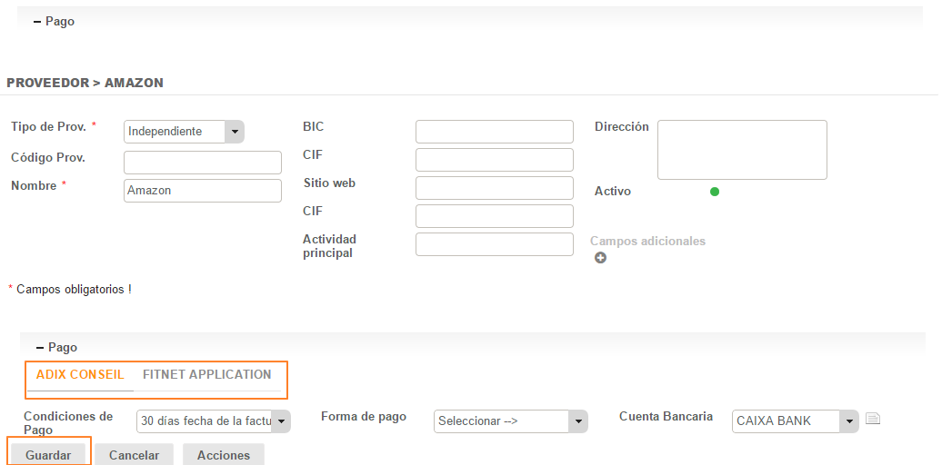 Una vez realizado esto, podemos definir los datos de pago por empresa : las condiciones de pago, las formas de pago y la cuenta bancaria. Para ello debemos presionar en el nombre de la empresa en la pestaña Pago y realizar las modificaciones correspondientes en cada una de las empresas. Para que los cambios sean tomados en cuenta debemos presionar en el botón Guardar.