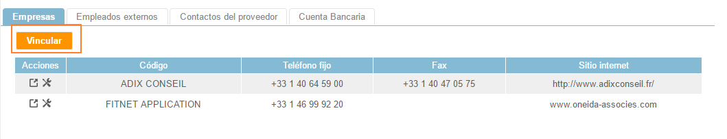 Para enlazar un proveedor a una empresa debemos ir a la pestaña Empresas abajo de la ficha del proveedor y presionar el botón Vincular.