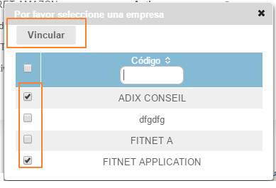 La lista de empresas disponibles en el entorno se muestran en la lista, debemos seleccionar las que deseamos enlazar y presionar el botón Vincular.