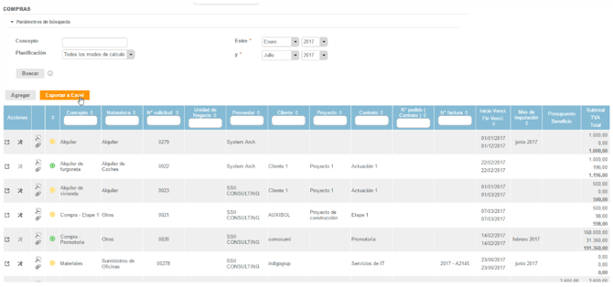 Podemos exportar en Excel la lista de compras según los parámetros de búsqueda seleccionados.