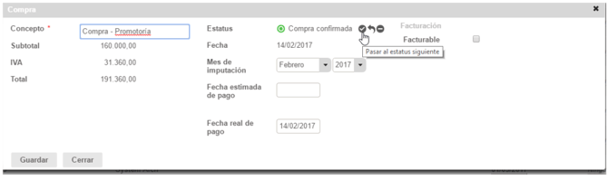 Podemos modificar el estatus de una compra directamente desde la compra presionando los botones :