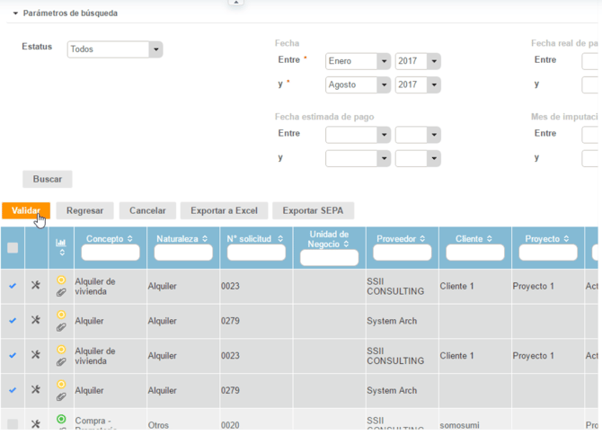 También lo podemos hacer en masa desde la lista de compras: seleccionando las compras y presionando los botones : Validar, Regresar o Cancelar.