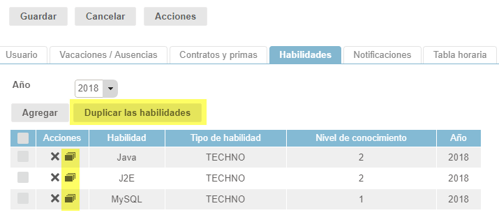 Buscando simplificar la introducción de datos, es posible duplicar habilidades de un año a otro, haciendo clic en el icono de duplicación o seleccionando varias habilidades y haciendo clic en el botón "Duplicar las habilidades":