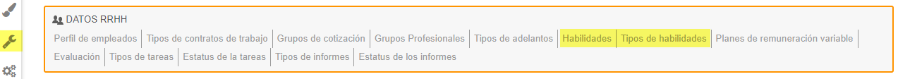 La lista de habilidades y los tipos de habilidades son totalmente configurables desde el menú "Configuración > Datos RRHH > Habilidades y tipos de habilidades":
