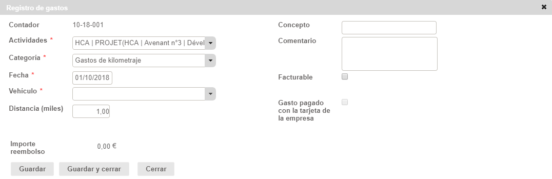 - Importe reembolsado: calculado automáticamente en función de la Tabla de tarifas asociada al vehículo y la distancia de la distancia recorrida