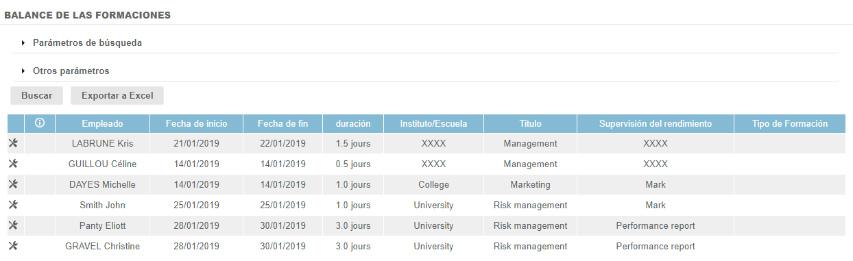 Permite encontrar todos los cursos de formación seguidos por los empleados durante un período determinado.