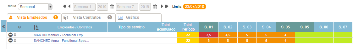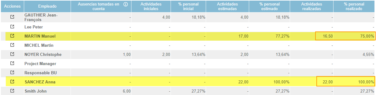 - Al segundo empleado se le asignan 16,5 días para el caso y 5,5 días para una formación, tiene una plantilla del 75%.