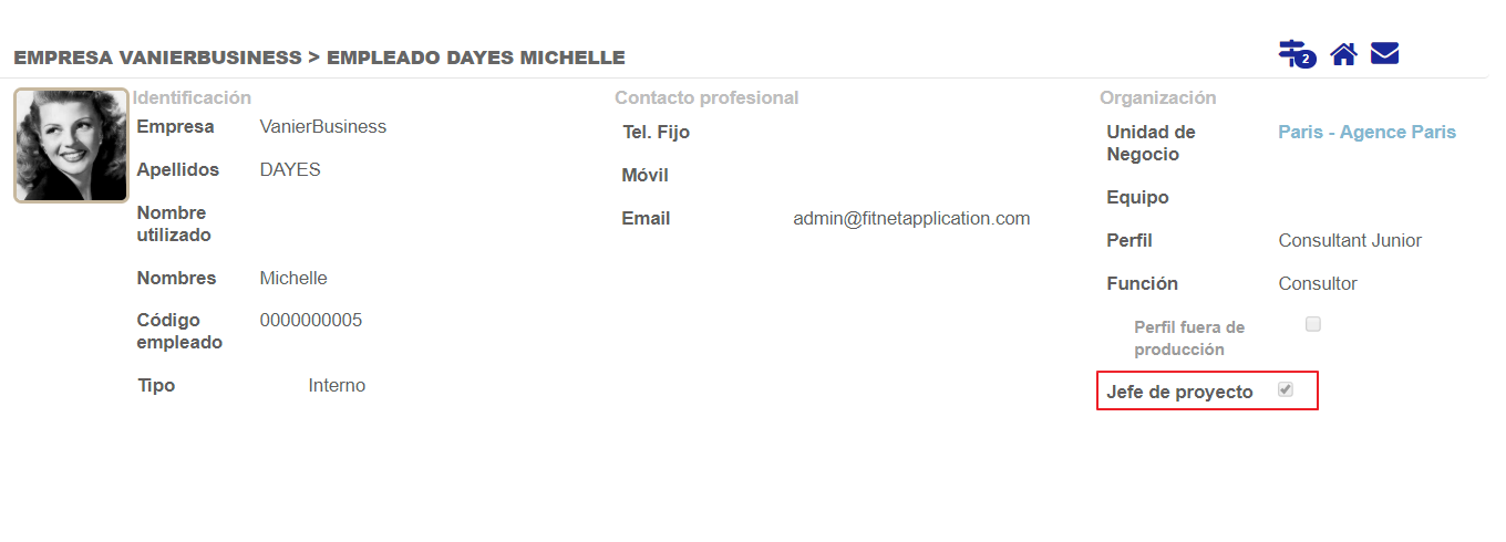 El jefe de proyecto es un colaborador con la casilla marcada Jefe de proyecto activada en su ficha.