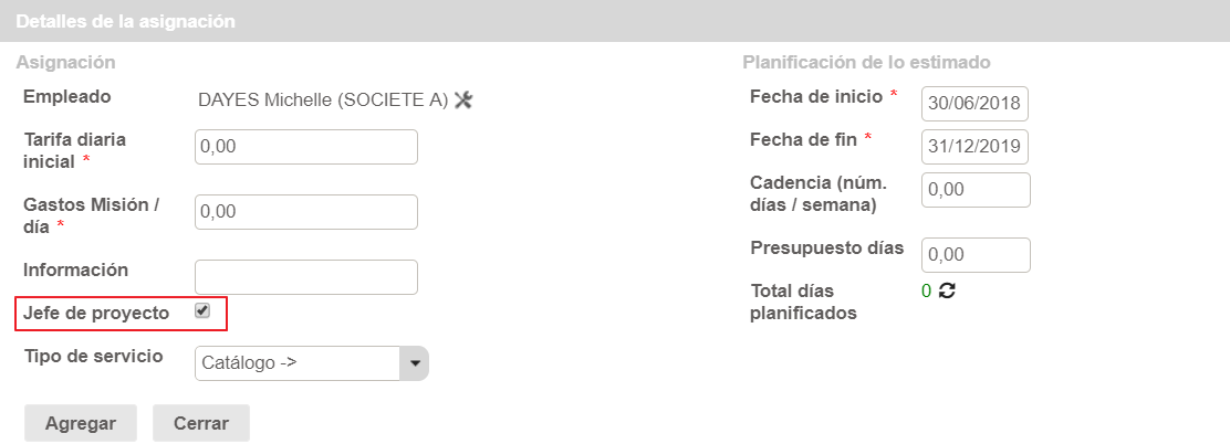 Para asignar un jefe de proyecto en los contratos, simplemente asígnele y marque la casilla de verificación de Jefe de Proyecto en la popup de asignación.