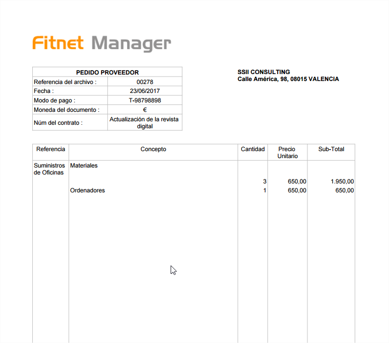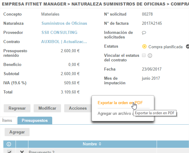 Podemos exportar el PDF de la orden de compra también desde la página "Administrar las compras".
