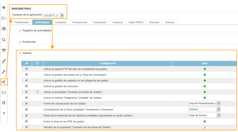 Para modificar la configuración del módulo Gastos, ir a Parámetros > pestaña Actividades > Gastos.