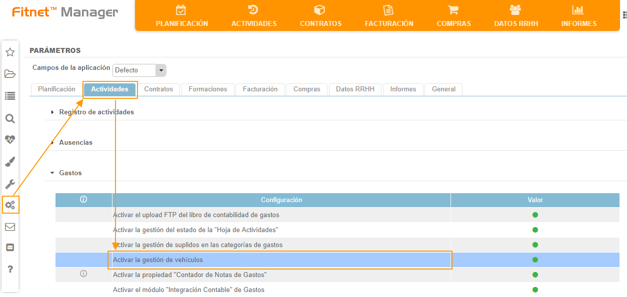 Para tener acceso a la Gestión de vehículos y gastos de kilometraje, debe activar la opción: Parámetros > Actividades > Gastos > "Activar la gestión de vehículos"