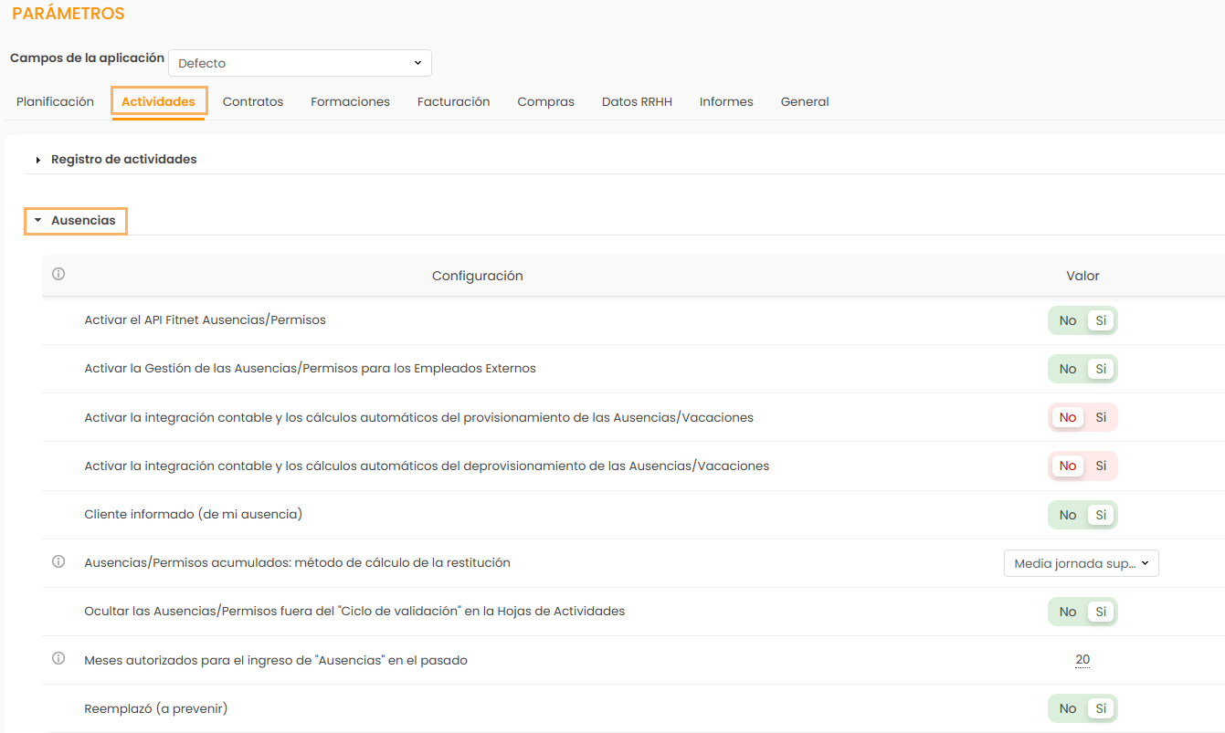 Para cambiar la parametrización del módulo Vacaciones, vaya a Parámetros > pestaña Actividades > Vacaciones.