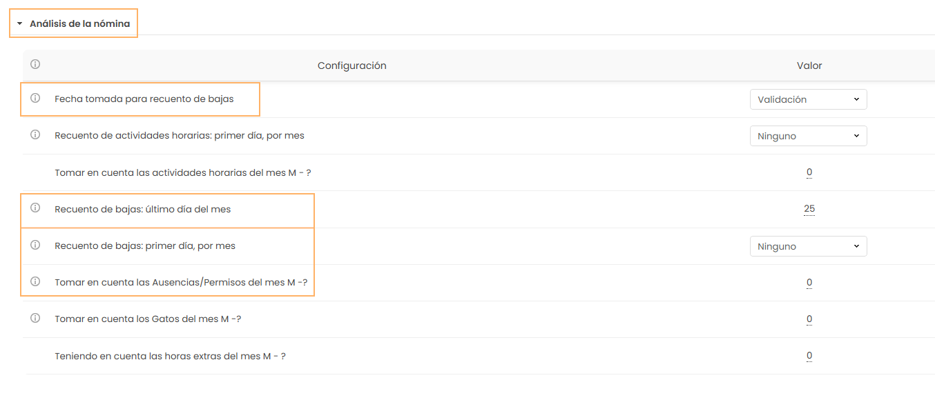 Nota: este valor solo se tiene en cuenta si el parámetro " Nómina del mes M : tomar en cuenta las Ausencias/Permisos del mes M -?" vale 0 (que es el valor predeterminado).
